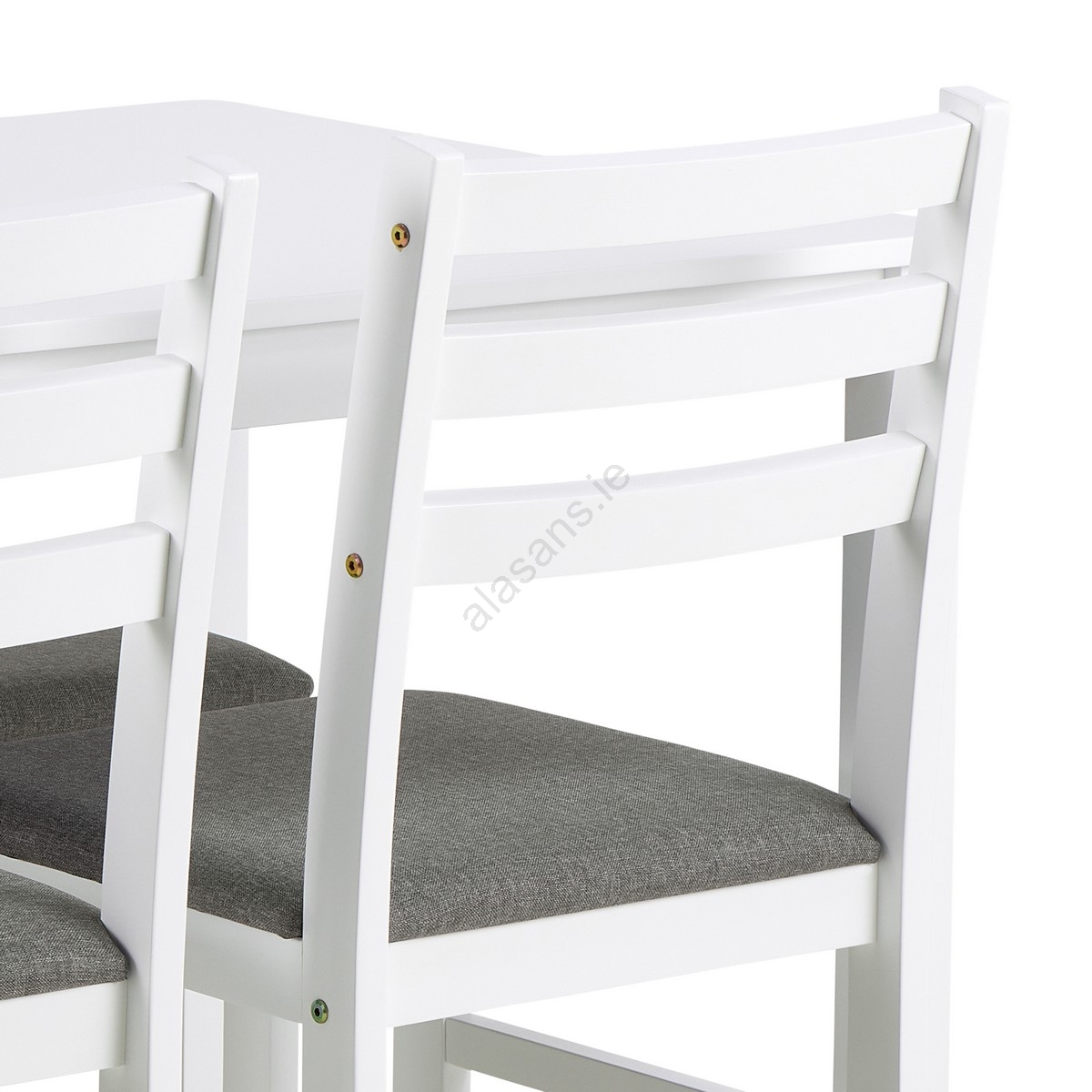 • Chairs: Sawana light gray fabric and white AC lacquered rubberwood, base white AC lacquered rubberwood.