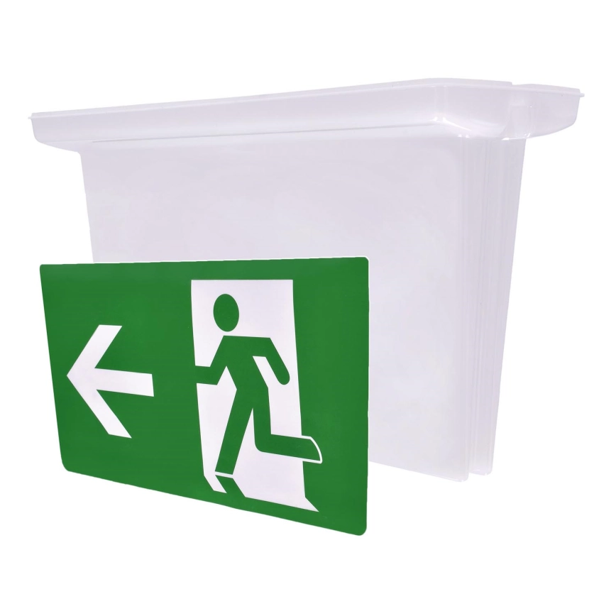 • Ceiling-mounted emergency sign for marking escape routes in public or commercial spaces.
