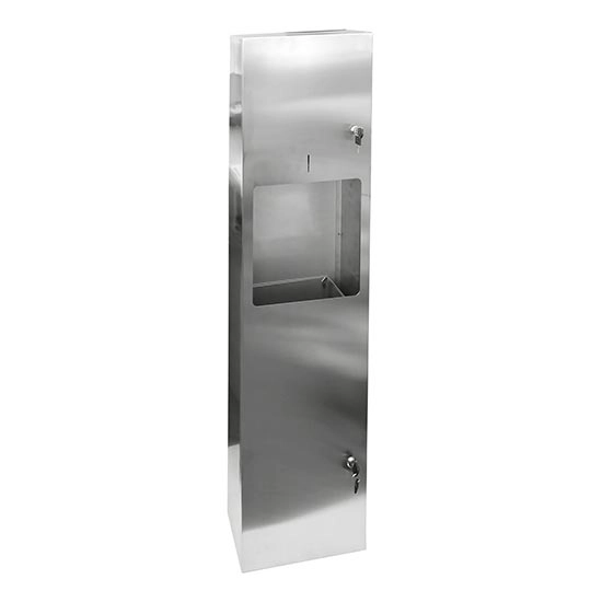• Freestanding paper towel dispenser with an integrated waste bin.