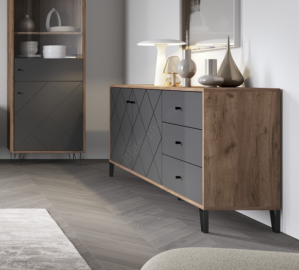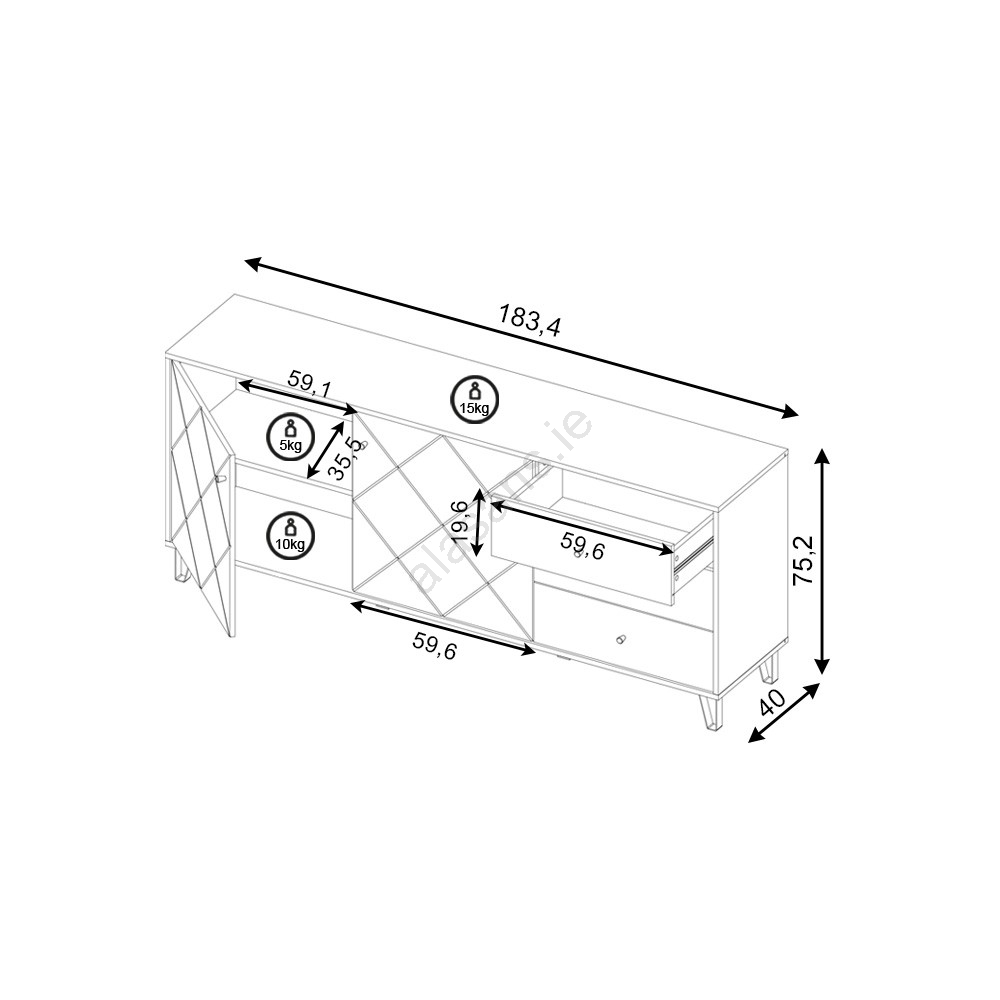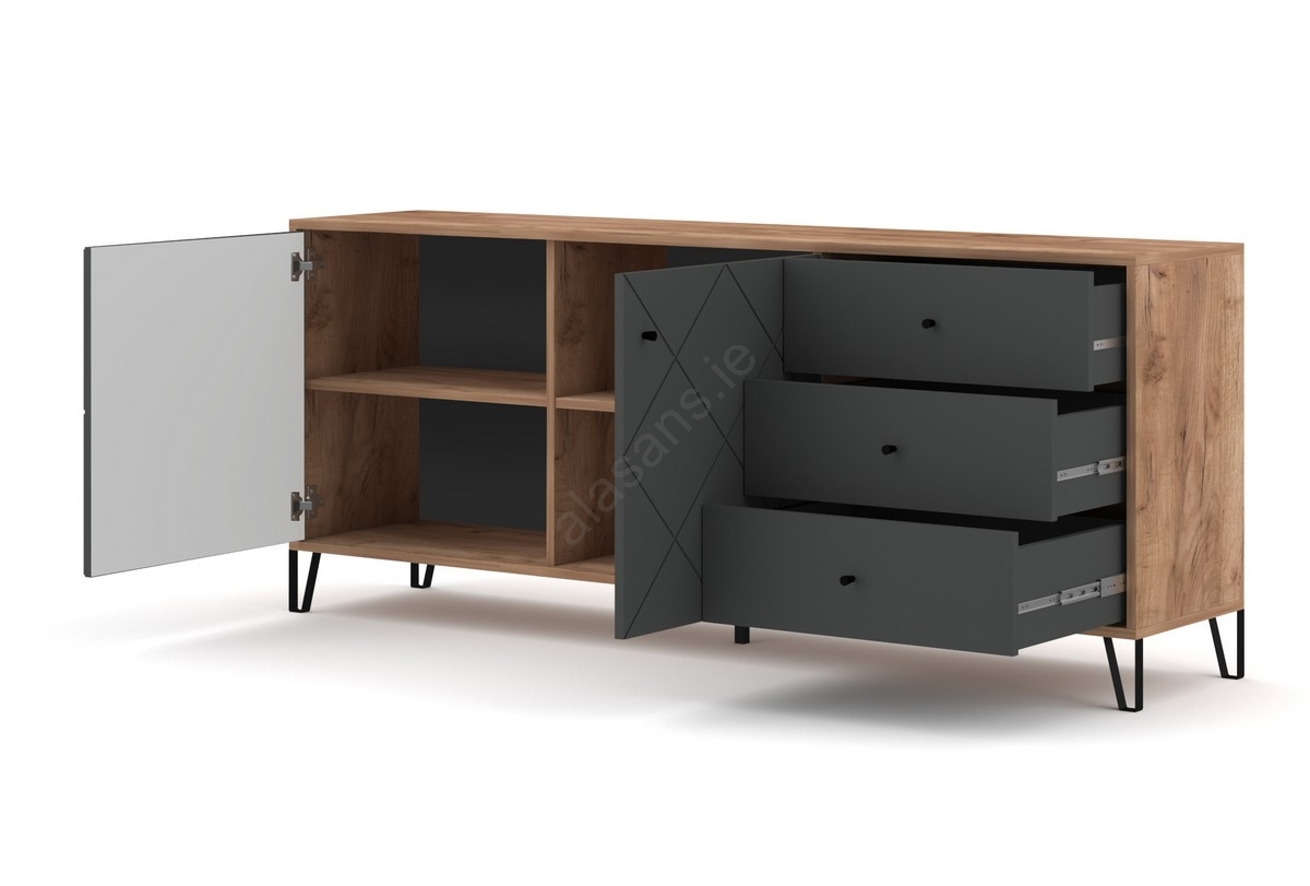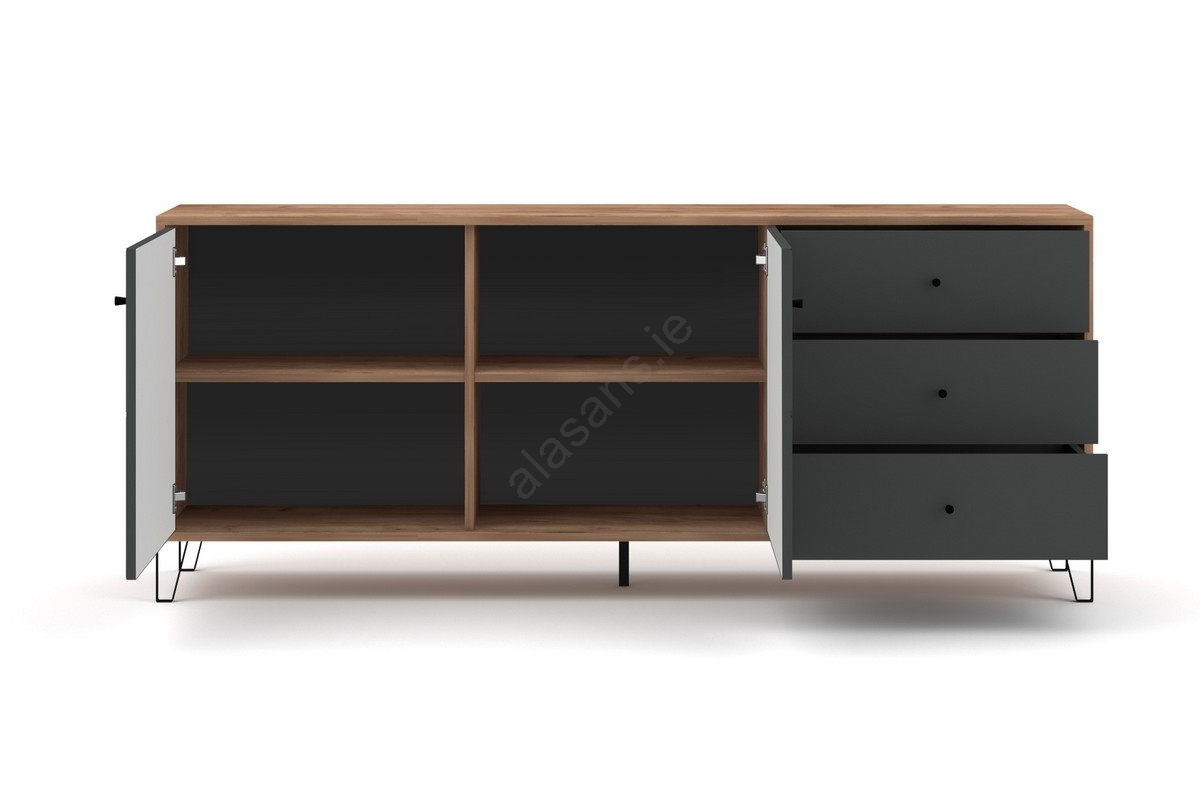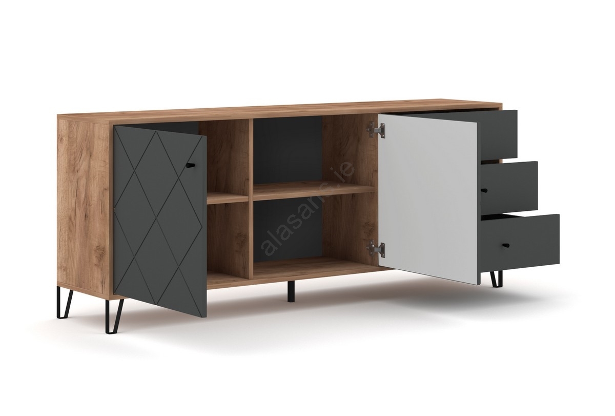• It features two doors on the left and three drawers on the right, providing neat, organized storage.