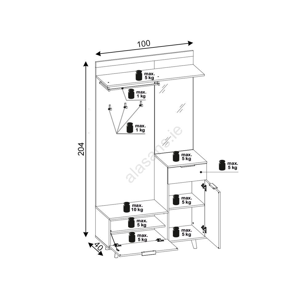 • Shelves, hooks, a coat rail and a large mirror provide practical, stylish storage.
