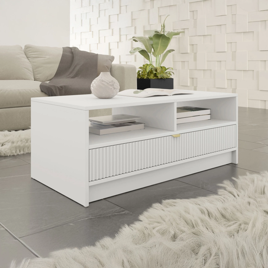 • Coffee table with a practical drawer and an open shelf to keep essentials close at hand.