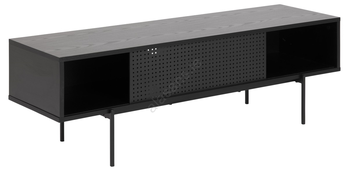 • Top and frame in black textured melamine; doors and base in matte black, textured powder‑coated steel.
