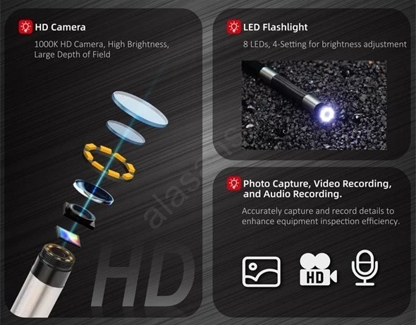 • At the probe tip is an 8 mm camera head fitted with eight LEDs and four adjustable brightness levels, ensuring optimal illumination of the inspected area.