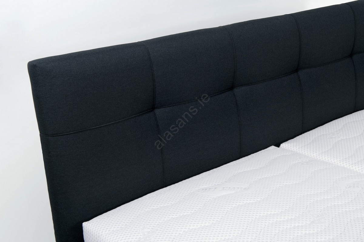 • Upholstered double bed with non-fixed mattresses features a finely crafted, elegantly quilted headboard.