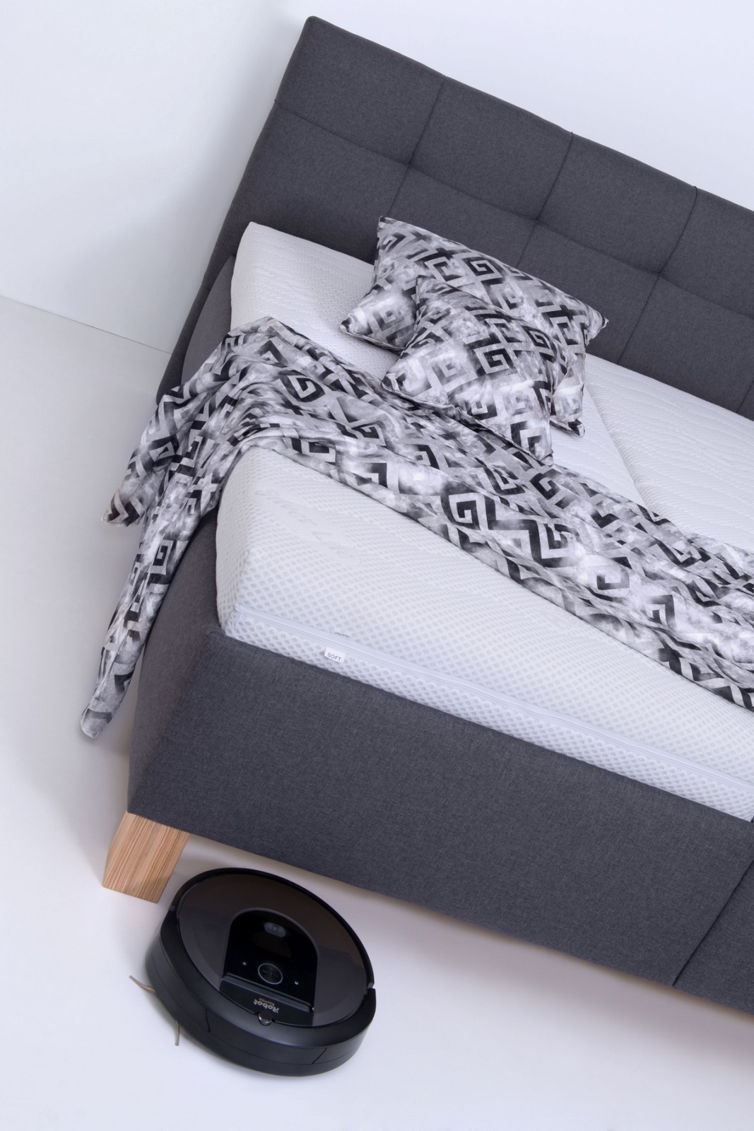 • The bed is equipped with a large storage compartment for storing bed linen and other items.
