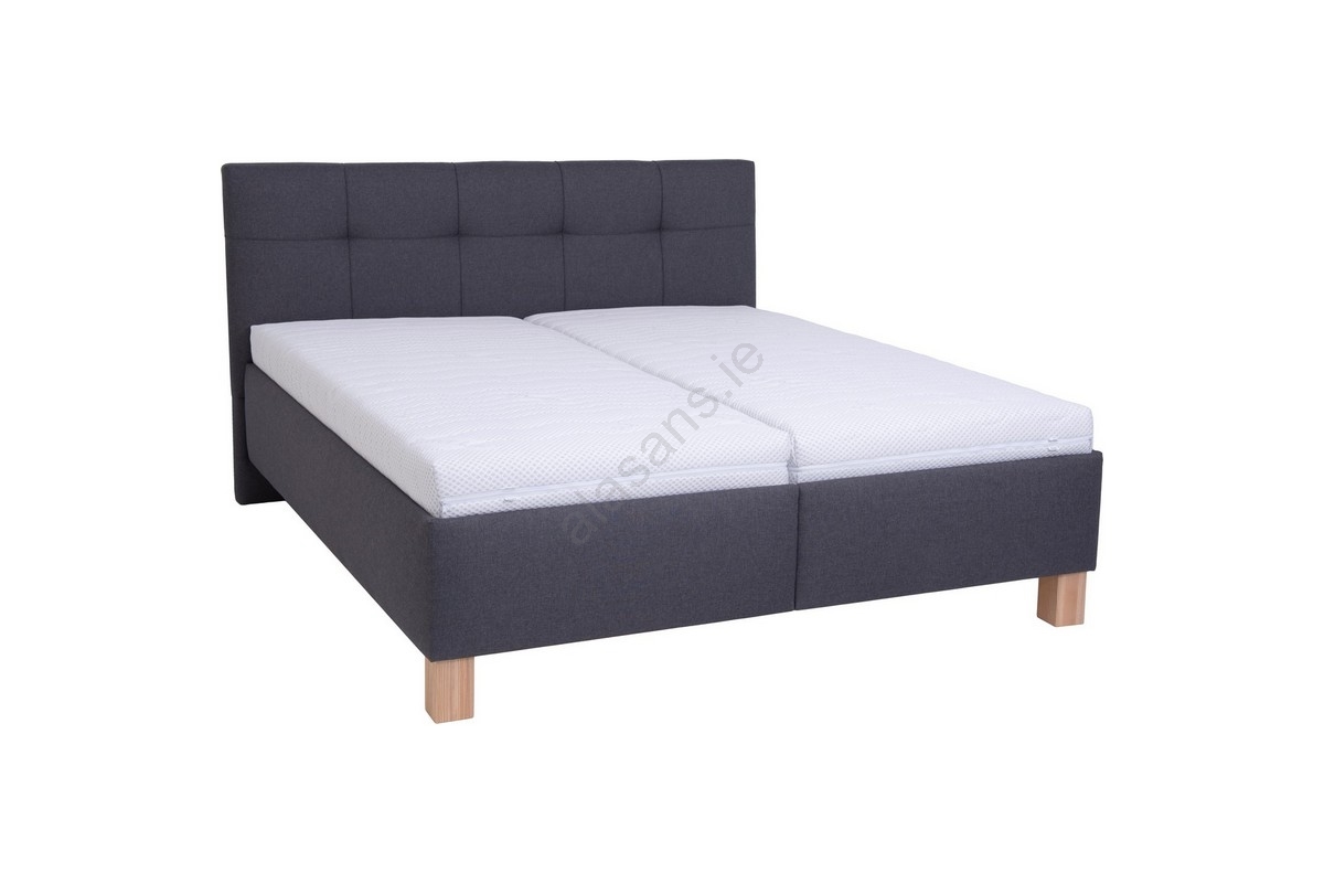 • Upholstered double bed with free-standing mattresses features a finely crafted, elegantly quilted headboard.