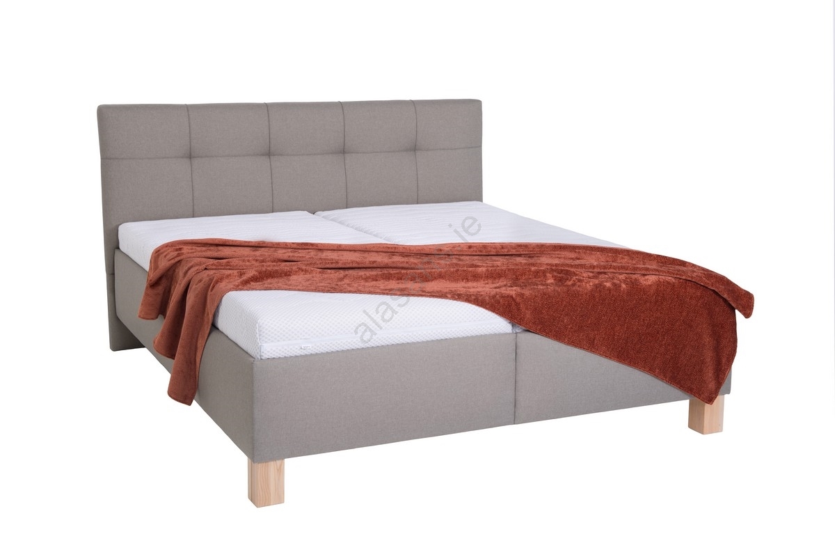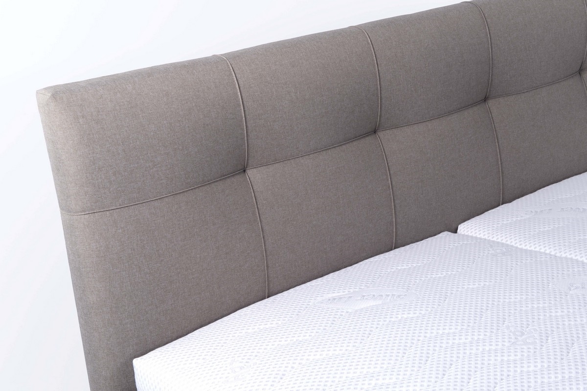 • Upholstered double bed with free-standing mattresses features a meticulously crafted, elegantly stitched headboard.