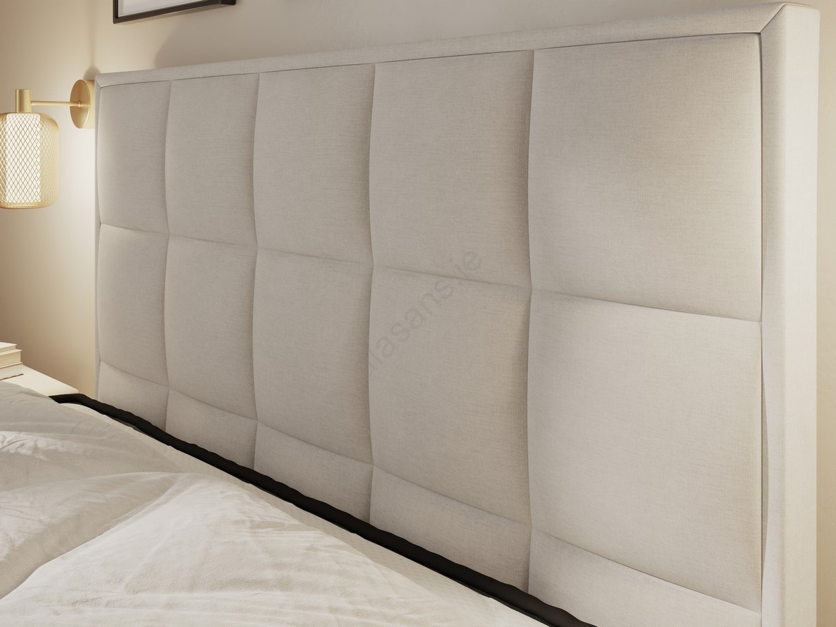 • Thanks to the tall headboard with square quilting, the plush mattress and the low, solid full-surface frame, the bed feels both very cozy and refined.