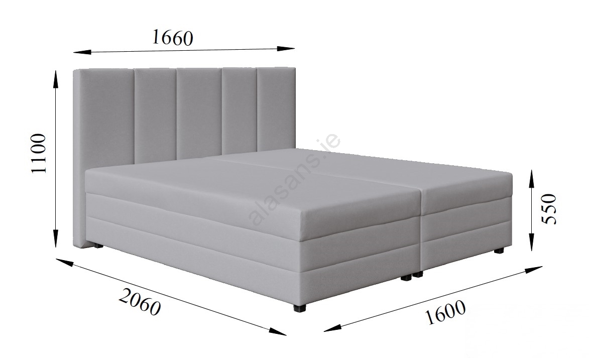 • Upholstered double bed with spring mattresses and a tall, straight, elegant headboard.