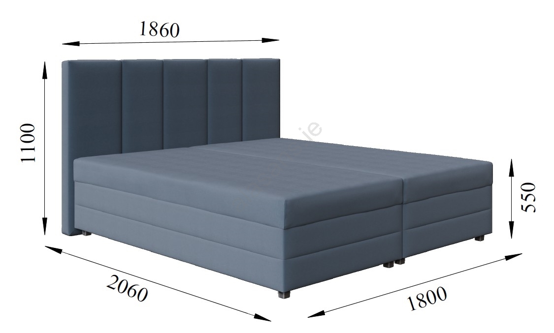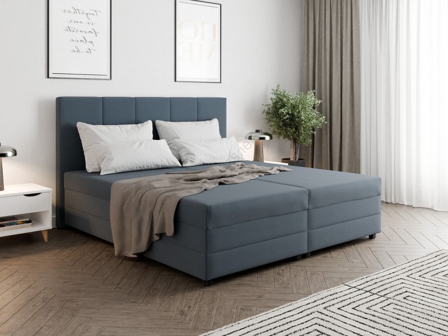 • Upholstered double bed with spring mattresses and a tall, straight, elegant headboard.