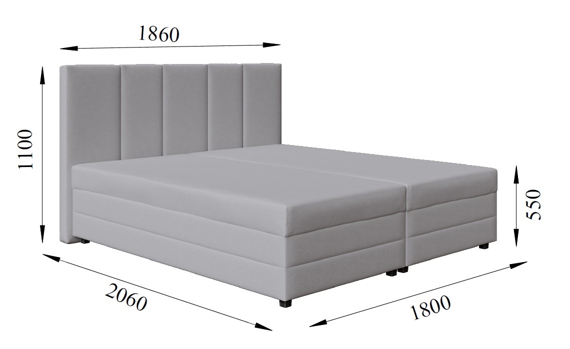 • Upholstered double bed with spring mattresses and a tall, straight, elegant headboard.