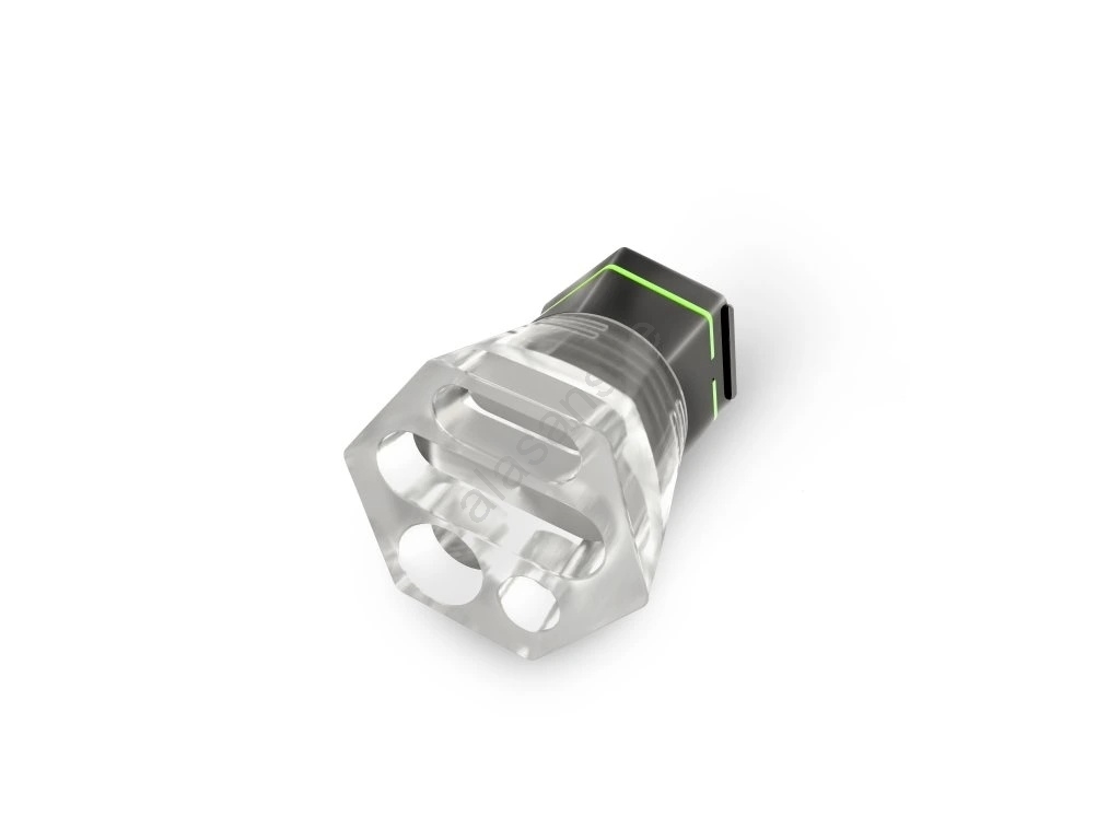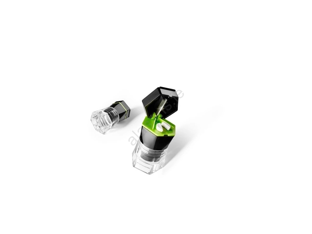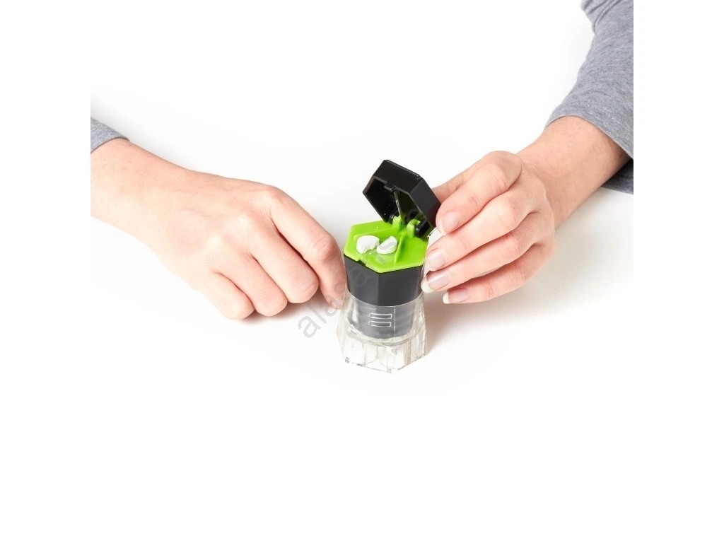 • The dispenser features a transparent design with black and green accents and makes handling medication quick and effortless.
