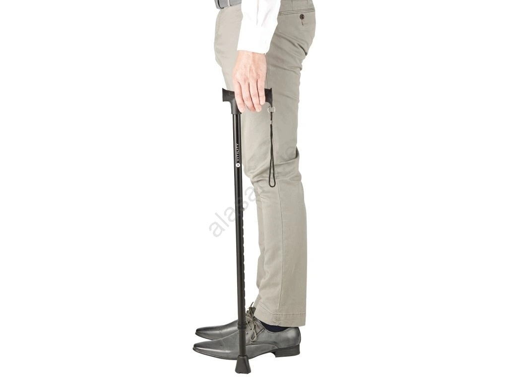 • The walking cane features an ergonomic handle.