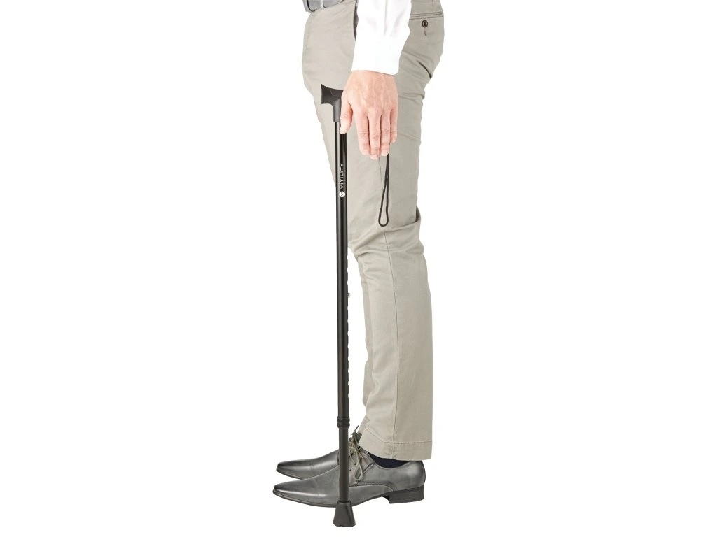 • The cane includes a push-button height adjustment.