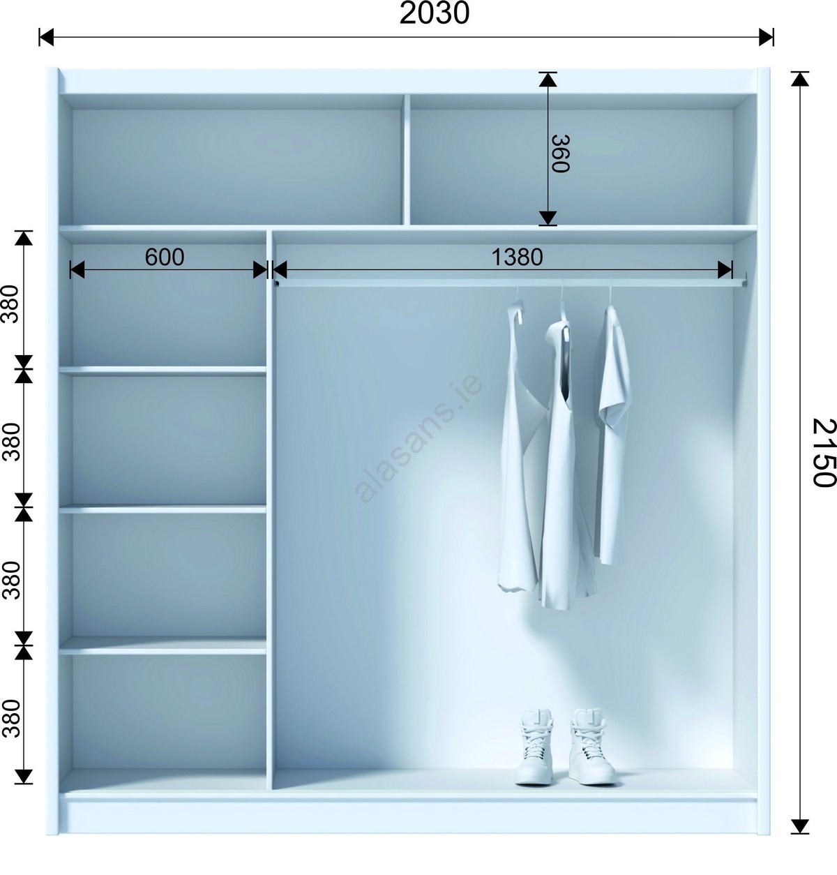 • The wardrobe features 4 open shelves, a hanging rod, and 2 top shelves for storing bags and seasonal items.