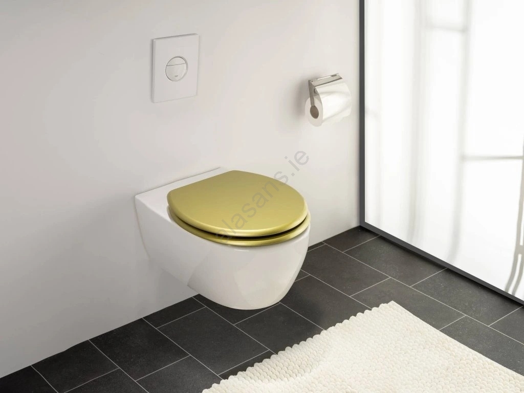 • An elegant toilet seat in a matte gold finish adds a luxurious touch to the bathroom.