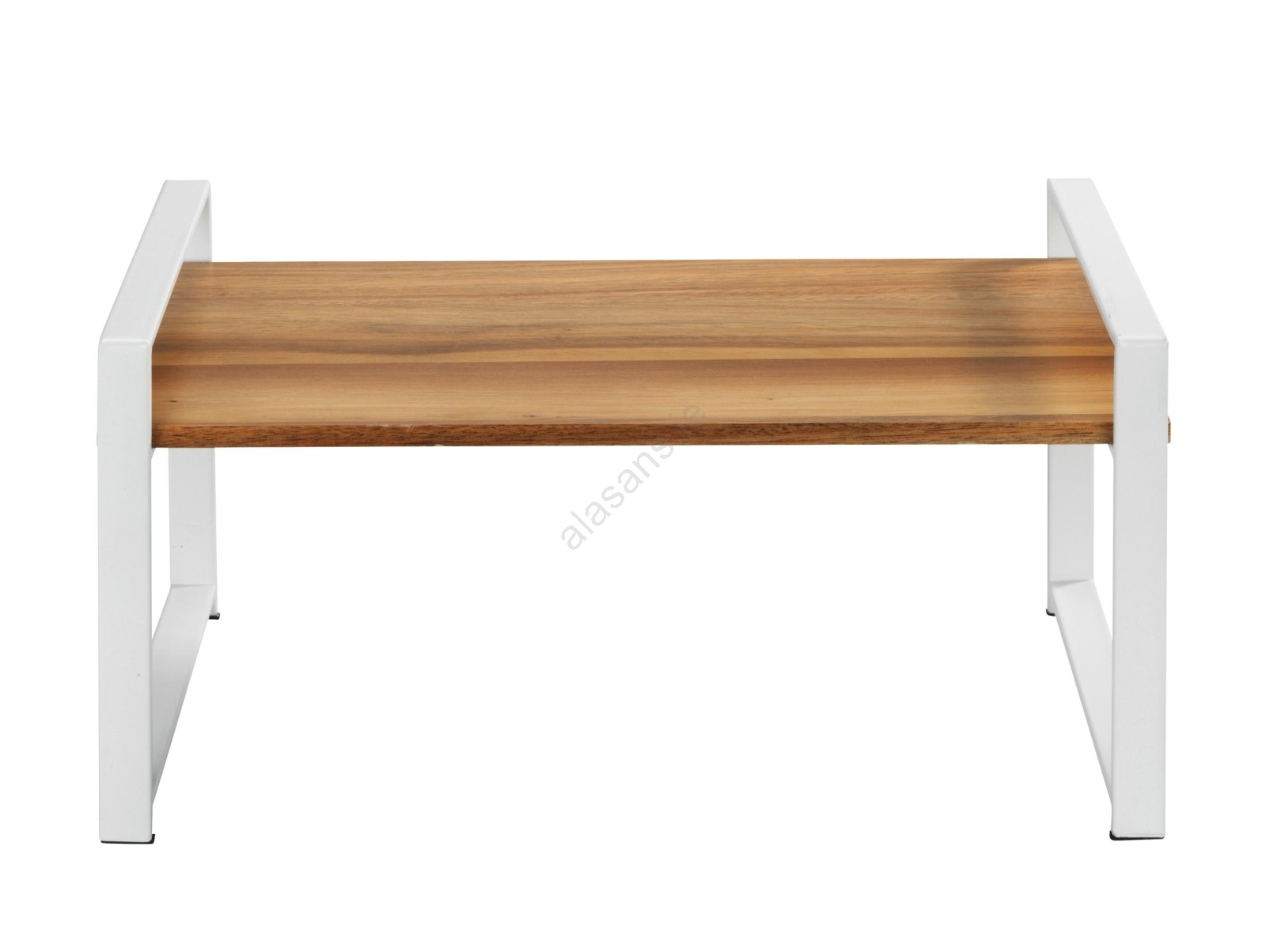 • Stylish combination of a white metal frame and an acacia wood shelf.