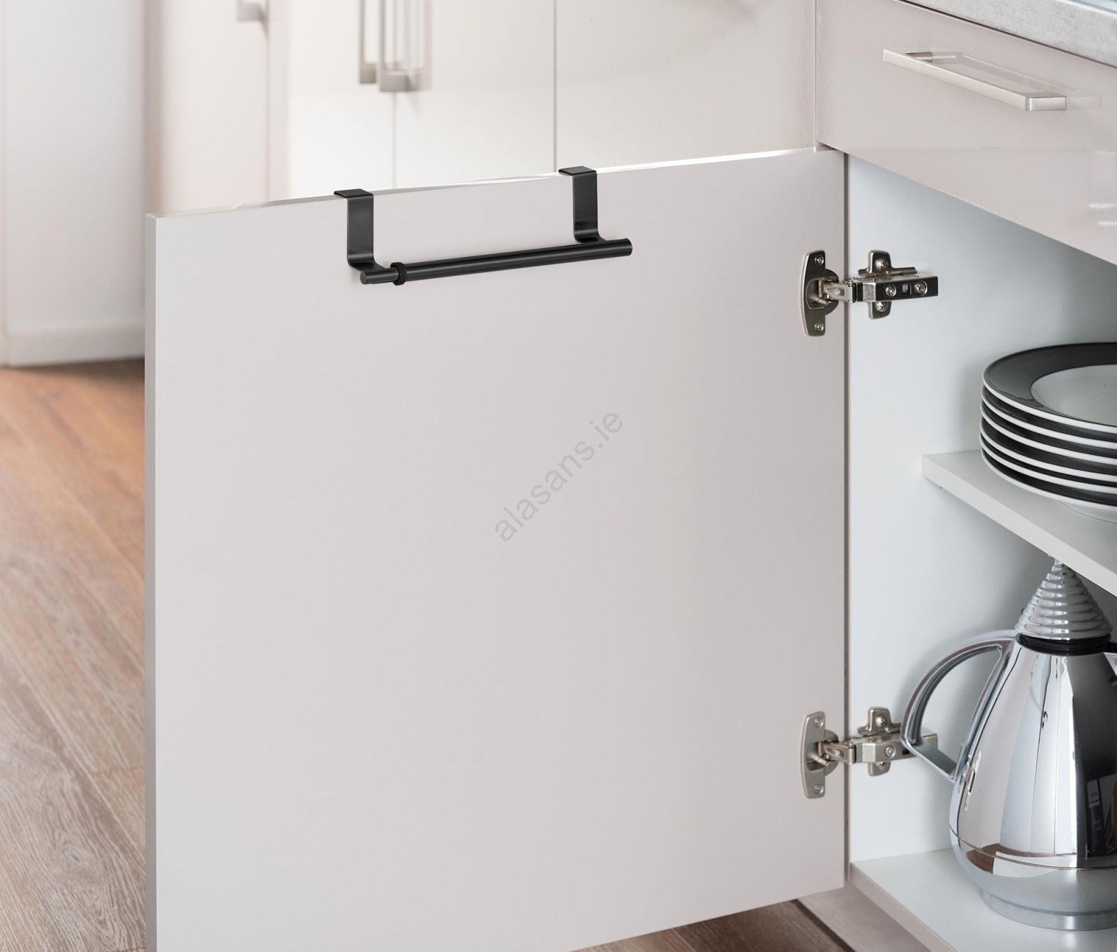 • Easy, drill-free installation – hangs on doors or drawers.