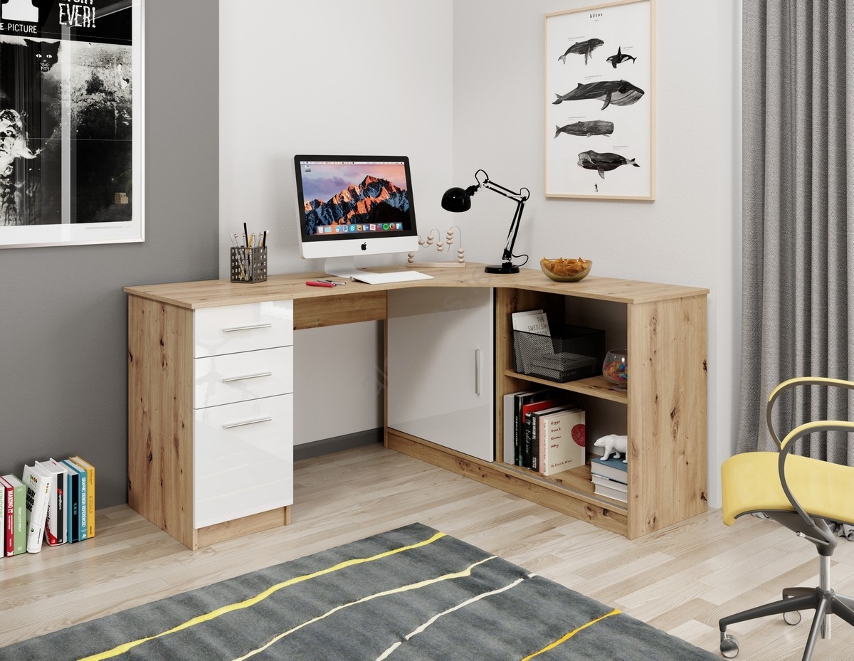 • ROBERTO Right-Hand Writing Desk with Shelf and Drawers, Artisan Oak/White
